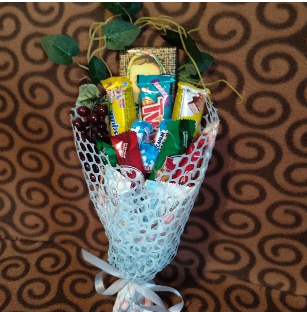 В очередной раз, насмотревшись различных видео на просторах вселенной интернета по теме сладкие букеты своими руками, мне тоже как-то захотелось попробовать сделать что-то на подобии такого. Набрала различных сладостей, упаковочной бумаги, деревянных шпажек, скотча, лент, картона и, расположившись за столом, попыталась создать свой «сладкий букет».