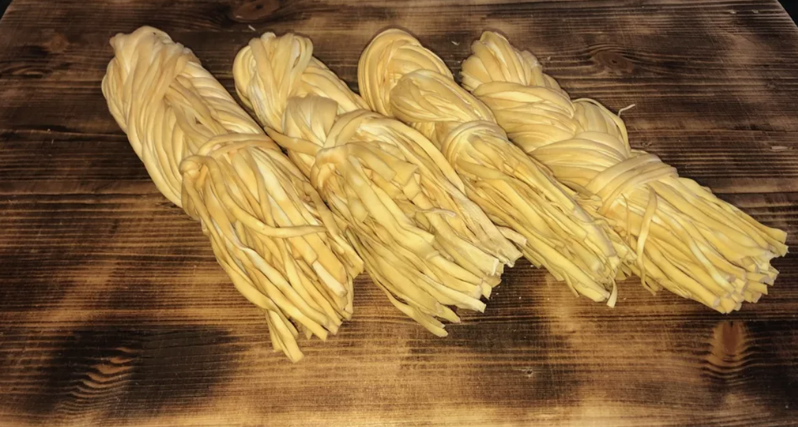 - Мячик сырного теста медленно растягиваем в длинный жгут. Частями опускаем его в горячую воду для эластичности. Когда длина сильно возросла, делим жгут на удобное количество частей. Каждую из них продолжаем вытягивать, опуская попеременно в горячую воду. Когда толщина жгутиков вас устроит (их диаметр может быть от 2–3 мм до 2 см), завершаем этап.