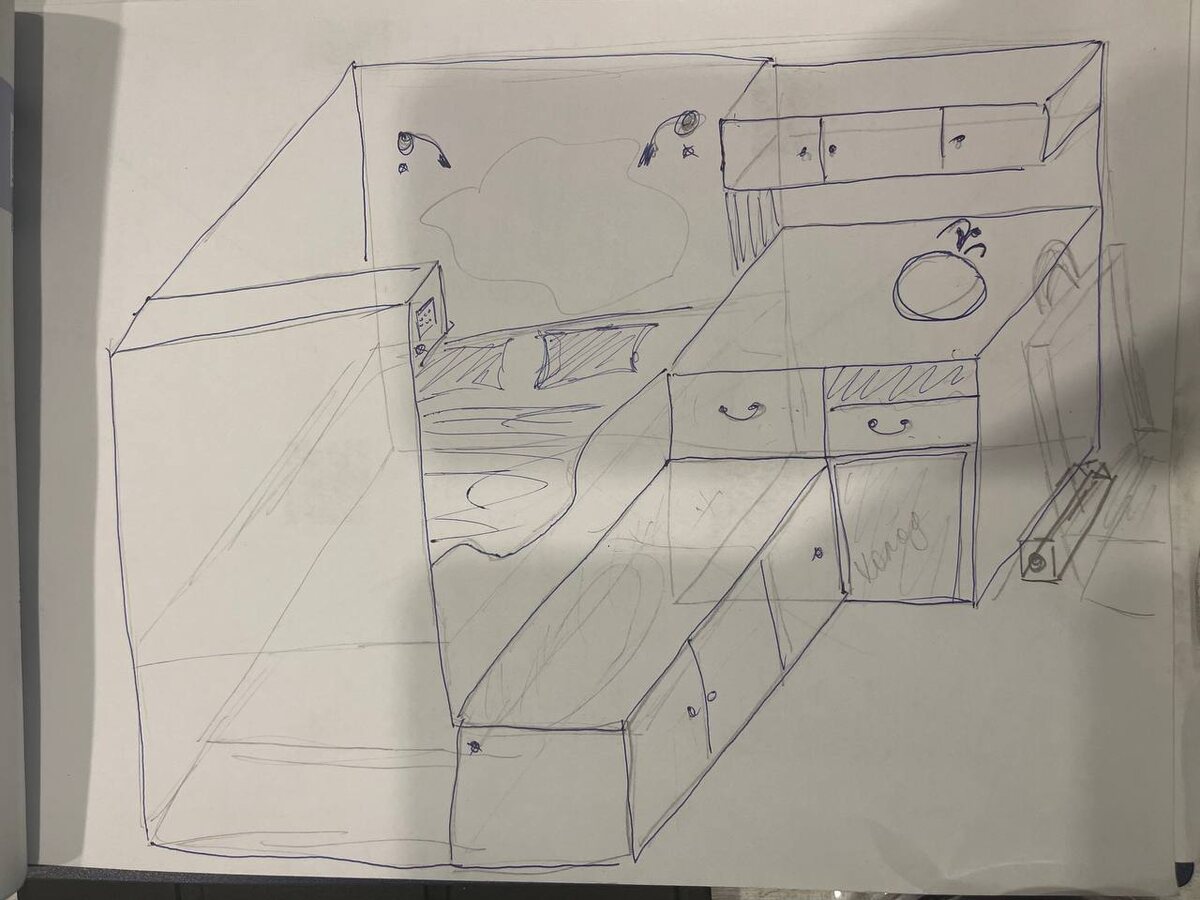 Ура, кровать на месте, пол положили, время строить мебель! План есть: Конечно, помимо этого схематичного рисунка было еще с десяток изрисованных листов со всеми просчетами до миллиметров каждого элемента по отдельности и вместе, схемы распила фанеры, списки с фурнитурой и т.д. Всю нашу мебель мы разделили на элементы, которые собирали отдельно и закрепляли по месту: спинка сидушки, шкафчик над кроватью, шкафчик над кухней, кухонная тумба, сидушка, ну и кровать, но ее мы уже сделали, а сейчас об остальном по порядку) Первое что мы сделали это спинка сидушки, что бы удобней было залезать на кровать, сделали небольшое углубление. Следующие по порядку это шкафчики: над кроватью и над кухней - они почти одинаковые, но не совсем)) Фанеру мы распилили бесплатно в Максидоме - это быстро и точно. Самым сложным в этих шкафчиках было сделать боковые стенки, так как кузов сужается к верху, а мы не хотели что бы с боков были большие щели. Для этой задачи использовали картон, сделали из него "выкрой
