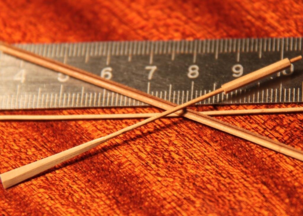 Теперь остается сделать лопасть весла. Для этого необходимо, для начала, нарастить ширину цевья на его дистальном конце, приклеив к нему пару фрагментов реек шириной по 1,5 мм. При этом соединение будет значительно надежнее, если по кромке рейки предварительно выбрать ложбинку с радиусом 0,5 мм.