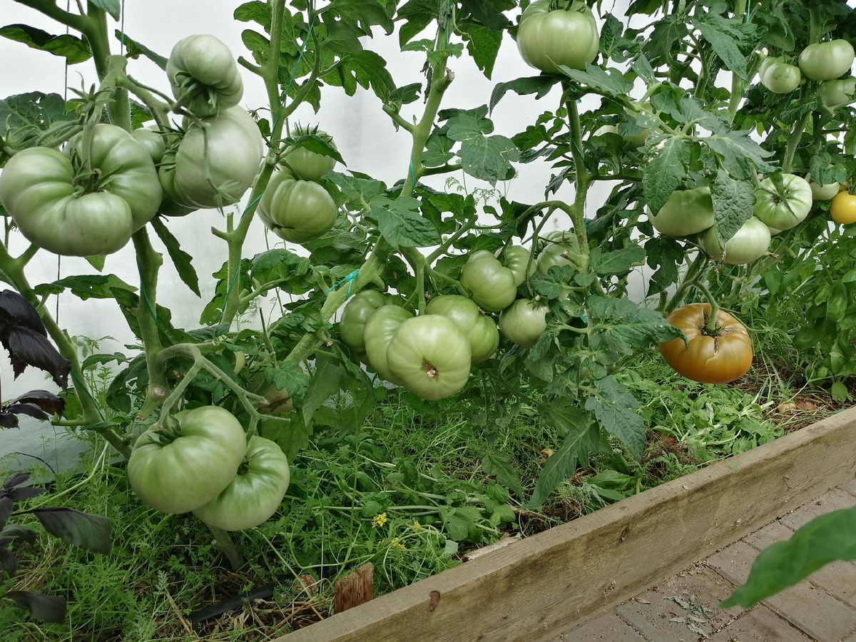 Продолжаю вас знакомить с томатами гномами.Сегодня расскажу о сорте Среднеспелый, детерминантный, заявлен как низкорослый (50-60 см в ОГ и до 1м в теплице). Плоды плоскоокруглые, ближе к плодоножке ребристые. К моменту созревания плоды становятся горчичного цвета. Вес 100 - 300 г, отдельные плоды могут быть крупнее. Кожица плотная, мякоть очень сладкая, сочная, мясистая и мало семян. Подходит для свежего потребления и некоторых видов заготовок. У меня вырос более 1м 20. Очень урожайные кусты.Сажаю каждого сорта по 2 куста. Томаты росли хорошенькие,весь урожай практически был внизу. Редко кое-где были помидорки вверху. В основном верхний цвет весь облетел в самую жару.Если бы все томаты завязались ,то это были бы шикарные гномы. Я очень переживала в июне что нет завязей. Попозже гномики удивили. В июле стояли большие шары гномов. Помидоры до самой зрелости находились на кусту. Я на эти помидоры очень долго смотрела и моя вина в том, что я долго их не снимала . Они все больше напи