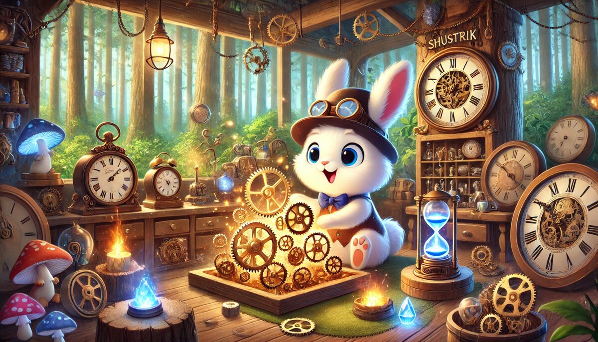 В зеленом солнечном лесу жил зайчонок Шустрик. Он был не просто зайчонок - он был изобретателем! Шустрик любил собирать разные штуковины и мастерить удивительные вещи. И вот однажды ему в голову пришла невероятная идея: построить машину, которая сможет путешествовать во времени!