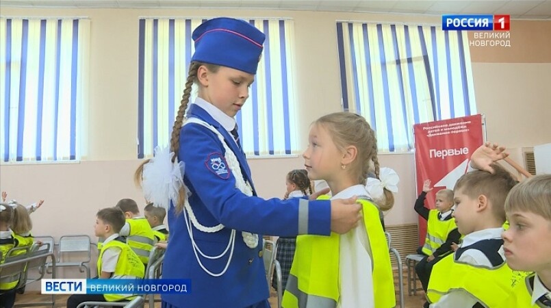 Первоклассники новгородской школы №25 «Олимп» получили в подарок световозвращающие жилеты