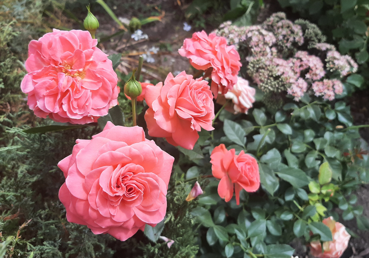 В этом году, благодаря ведению канала на Дзен, у меня есть возможность отследить, сколько раз я писала о каждом своём цветнике. Честно говоря, раньше я не обращала на это внимание и никак такие нюансы не фиксировала, и тем более не запоминала. А получается, что о клумбе у калитки сейчас я пишу в четвёртый раз, потому что в течении года не стыдно было показать его фотографии, первый раз я делала это в мае, когда цвели тюльпаны. Ну, я была недовольна этим цветником, но только из-за пересорта, с моей стороны «косяков» не было- задумка была хорошая и всё пошло не по плану не по моей вине. Потом я демонстрировала его цветение на 31 мая, до града. Всё было хорошо и по сочетаниям, и по общей декоративности. Затем было повторное цветение роз в июле, и оно тоже не подвело. И вот сейчас наступил сентябрь, а этот цветник опять никаких нареканий не вызывает. Ну, может быть, следующей весной нужно будет посильнее обрезать кариоптерис, это уже если начать придираться. Он очень гармонично сочетается