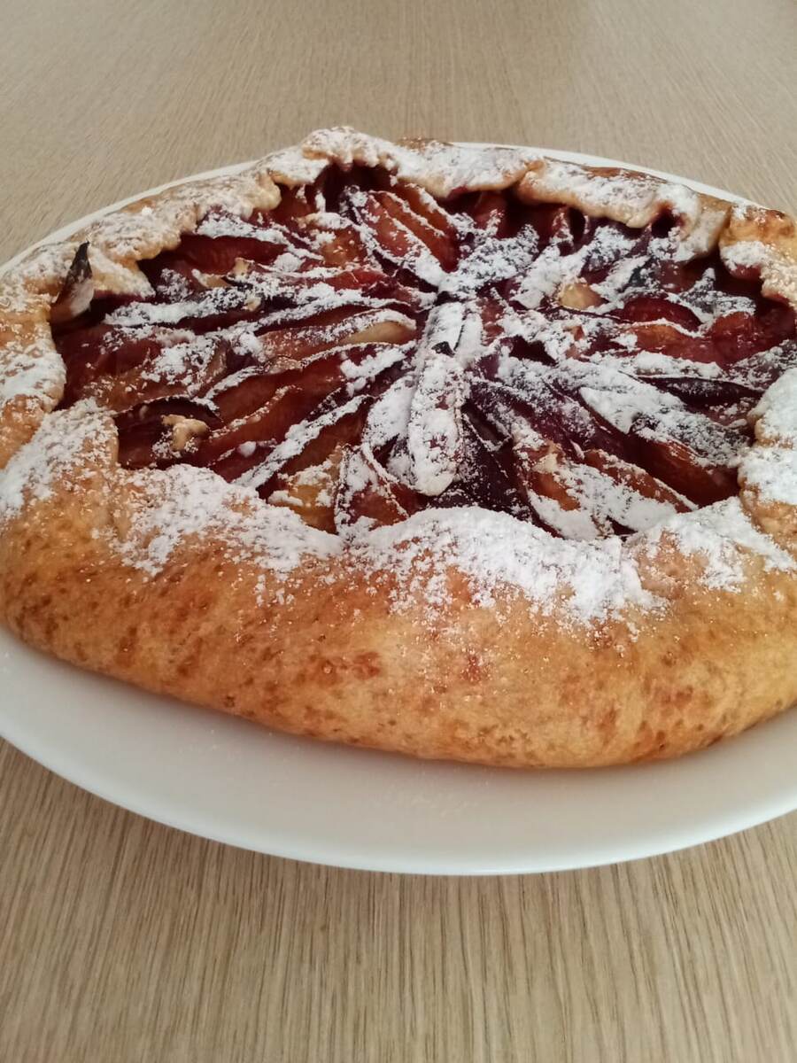200гр муки 100гр сливочного масла Щепотка соли Делаем крошку 1ст.л. сахара 5ст л. вода ледяная Собрать тесто в шар, долго месить не нужно. Убираем в холодильник на 30-40мин. Сливы 300гр., это 8шт. Режем тонкими дольками. Тесто раскатываем на пергаментной бумаге, порвавшиеся края немного собираем. На тесто кладём крахмал 1ст.ложку., далее сливы. Посыпаем сверху с помощью сита смесь крахмала 1 ч.л. и сахарной пудры 1 ч. л. Заворачиваем края. Выпекать при температуре 180° 35-45 мин.