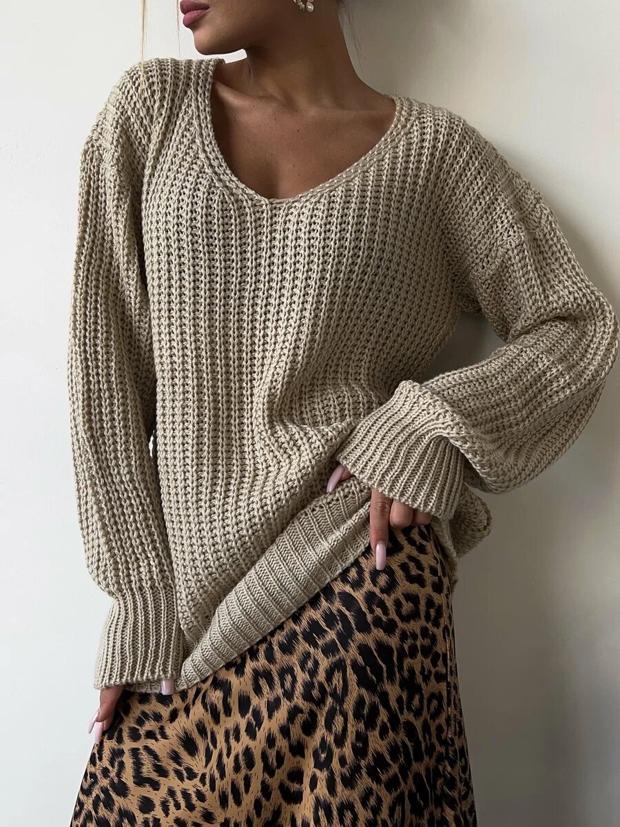 Свитер женский оверсайз бренда KIAZO с v образным вырезом. Благодаря крупной вязке сетке джемпер легкий, мягкий, но очень теплый и уютный. Удлиненный трикотажный свитерок паутинка подойдет под лосины. Классический однотонный принт делает свитер базовым. Вязанная кофта с широкими рукавами отлично смотрится в тандеме с рубашкой, получается нарядный, при этом офисный или деловой стиль. Объемный свитер будет в пору на маленький и большой размер. Тонкий свитер можно носить на одно плечо, что будет смотреться по-настоящему стильно. Чтобы изделие не потеряло форму, стирать его необходимо в деликатном режиме. Сушить естественным образом, разложив на горизонтальной поверхности