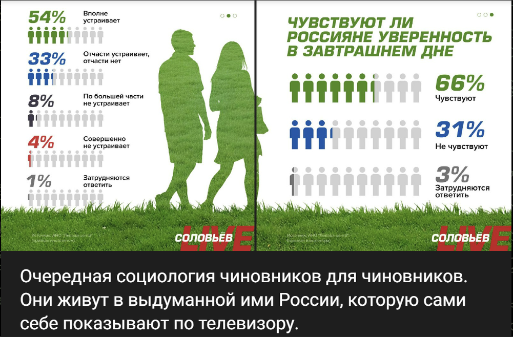 Об этом заявила у себя в Телеграм-канале заслуженная артистка России, дочь актрисы Лидии Федосеевой-Шукшиной и писателя Василия Шукшина, Мария Шукшина. Всё это (и не только) Шукшина написала у себя на канале, усомнившись в статистических выводах исследовательской организации, которая утверждает, что россияне "стали жить лучше". Результаты исследования были выложены на канале журналиста Владимира Соловьёва. В них утверждается, что большинство россиян довольны своей жизнью и их якобы "всё устраивает": Но Мария Шукшина этим результатам не поверила. "Поскольку в тг-канале у Соловьева комментарии запрещены, предлагаю поделиться здесь своим мнением по поводу «Кому на Руси жить хорошо»", — начала свой пост Мария Шукшина, косвенно упрекнув Соловьёва в том, что он отключает народу возможность комментировать его посты. После чего артистка привела в пример статью 1993 года советского и российского профессора, в которой утверждается, что "более трёх четвертей молодых людей испытывают чу