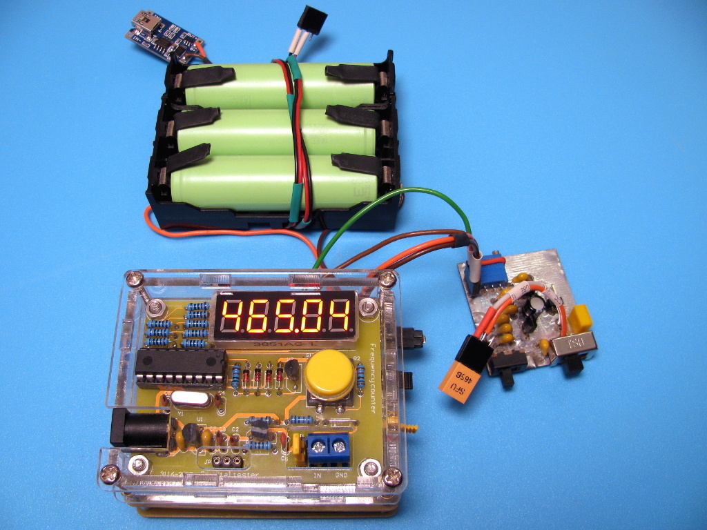 Кроме замены фильтров также для питания данной схемы вместо одноразовой батарейки "Крона" с напряжением 9 вольт попробовал использовать литий-ионный аккумулятор на 3.7 вольта. При таком пониженном напряжении питания схема тоже работает стабильно, но стоит учитывать и соответствующее снижение уровня выходного сигнала.