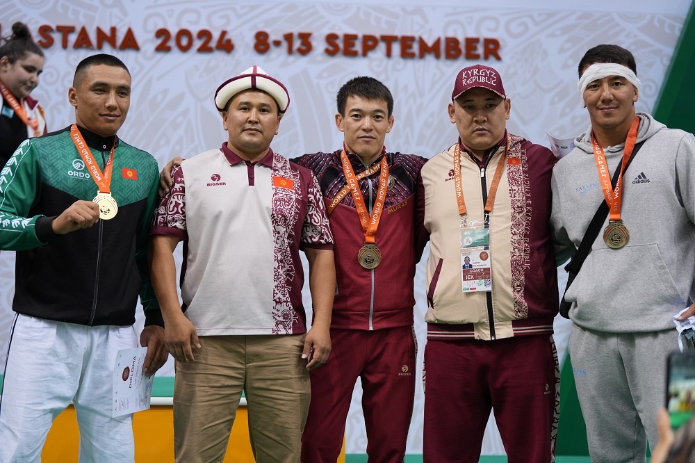 Астанада өтүп жаткан V Дүйнөлүк көчмөндөр оюндарында Кыргыз Алыш күрөшү боюнча курама команда 7 медаль, анын ичинен 3 алтын утту. Эркектер арасында Баяман Абидинов менен Ирлан Казбек уулу, аялдар арасында Нагира Сарбашева өзгөчөлөнгөн. 🥇 Астанада өткөн V Дүйнөлүк көчмөндөр оюндарында кыргыз күрөш боюнча курама команда ийгиликтүү оюн көрсөттү. 🤼♂️ Эркектер арасындагы мелдеште Баяман Абидинов (60 кг) менен Ирлан Казбек уулу (80 кг) алтын тагынды. 🥉 Эркектер арасында коло медалдар Калысбек Каюмов (70 кг) менен Азизхан Мусабек уулуна (90 кг) ыйгарылды. 👩🎤 Кыз-келиндер арасындагы мелдеште 75 килограммдан жогорку салмакта Нагира Сарбашева чемпион болду. 🥈 Нурзат Бактыяр кызы 65 кг салмакка чейинки кыз-келиндер арасында 2-орунду ээлесе, 70 кг салмакта Динара Камчыбекова улуттук курама командага коло алып келди. 🏆 Жалпы жыйынтык: Кыргыз курамасы 7 медаль, анын ичинде 3 алтын жеңип алды, бул спортчулардын жогорку деңгээлдеги даярдыгын көрсөтүп турат.