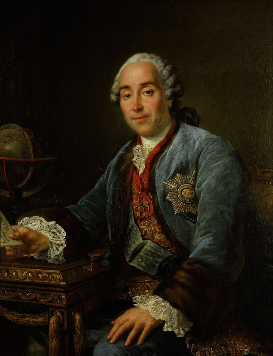 Во-первых, на мой взгляд, надпись на письме «Дмитрию Голицыну… в Вене» является, скорее, «адресом», то есть свидетельствует не о назначении князя послом в Вену, а о его нахождении уже там. Впрочем, раз эксперты уверены, что Д.М. Голицын запечатлен именно в парижском своем кабинете (что логично, учитывая, что автор портрета жил именно во Франции), значит, письмо с таким адресом изображено художником, так сказать, «авансом», немного опережая события. Во-вторых, обратите внимание на лежащий на столе под правой рукой князя камергерский ключ – знак соответствующего придворного звания. Д.М. Голицын получил его в 1755 г. Вообще, камергерский ключ носился на левой фалде кафтана рядом с карманным клапаном, но здесь он помещен в такую часть портрета, чтобы был виден зрителю. И в-третьих, и это главное, если датировка портрета и верна, и он действительно был создан в 1762 г., следовательно, он подвергался позднейшей переделке, потому что орден Св. Андрея Первозванного, звезда и лента которого видны на князе, он получил лишь в 1772 г. Тогда же на шею «переехал» орден Св. Александра Невского, который до получения Голицыным ордена Св. Андрея Первозванного, носился им на ленте через левое плечо.