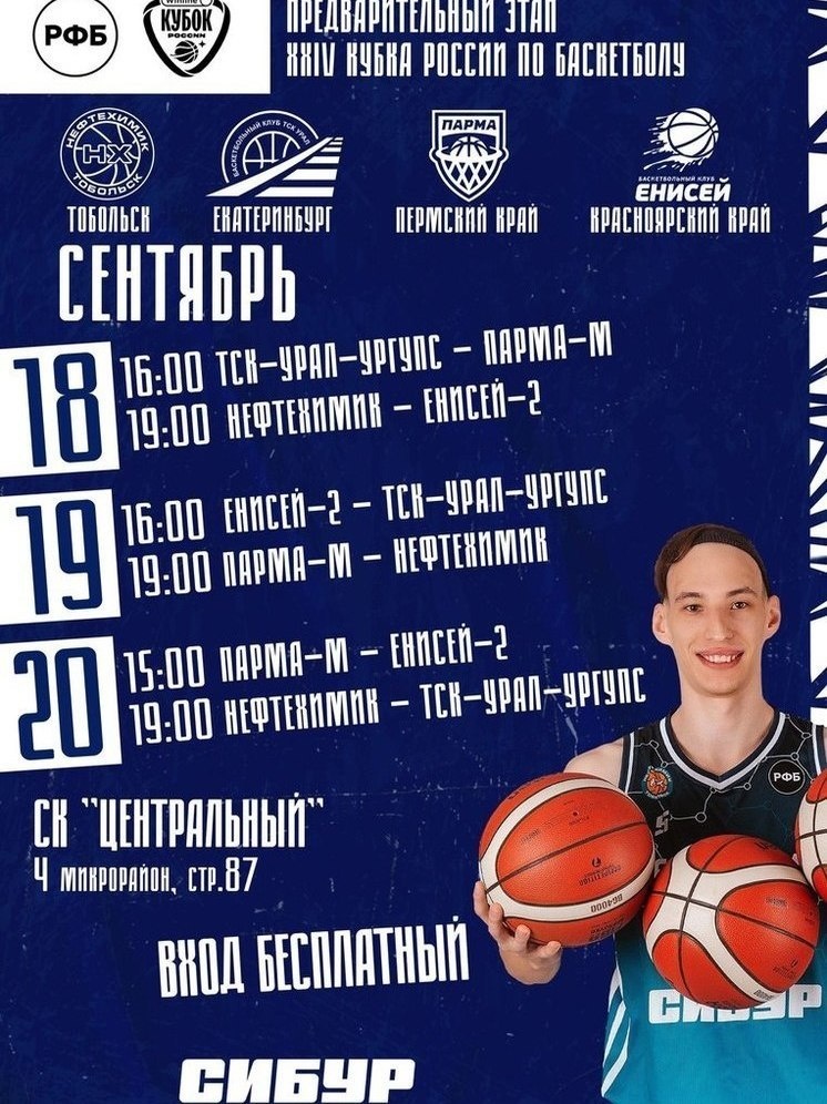 С 18 по 20 сентября в спорткомплексе «Центральный» всех тоболяков и гостей города ожидает зрелищное спортивное событие. Здесь пройдет предварительный этап XXIV Кубка России по баскетболу среди мужских команд. Тобольский «Нефтехимик» примет на своей площадке команды из Красноярского края, Екатеринбурга и Пермского края. Болельщиков приглашают в спорткомплекс "Центральный" (4 микрорайон, стр. 87), Тобольск. Вход свободный. Начало матчей тобольской команды в 19:00.