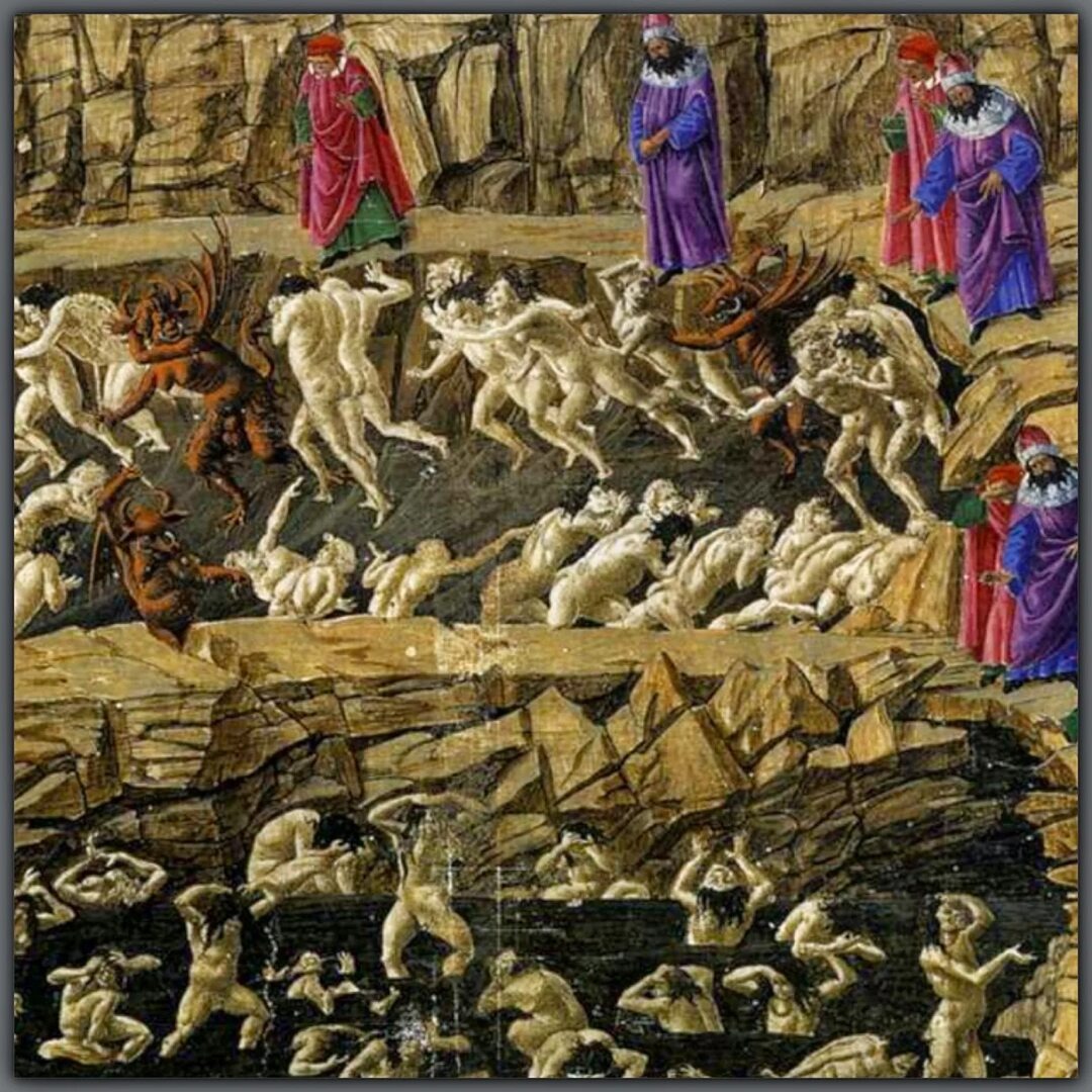 Вид наказания: Кипеть в кровавой реке. Тех, кто высунется, подстреливают кентавры Несс (мифология), Хирон и Фор.