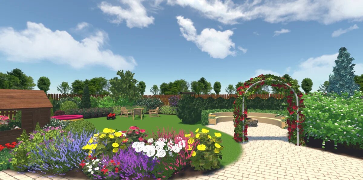 Чтобы проект получился максимально реалистичным, доступно редактирование любого шаблона из библиотеки. Например, можно поменять цвет и размер бутонов или листьев у растения, фасад здания, материал покрытия дорожки и т. д. Мы оформили проект участка с белым домом и уютной площадкой для отдыха с беседкой и водоемом. Ключевым акцентом стала парадная зона — придомовая территория и цветник в центре сада. К зданию ведет пошаговая дорожка с живым бордюром из однолетников и стриженого кустарника.