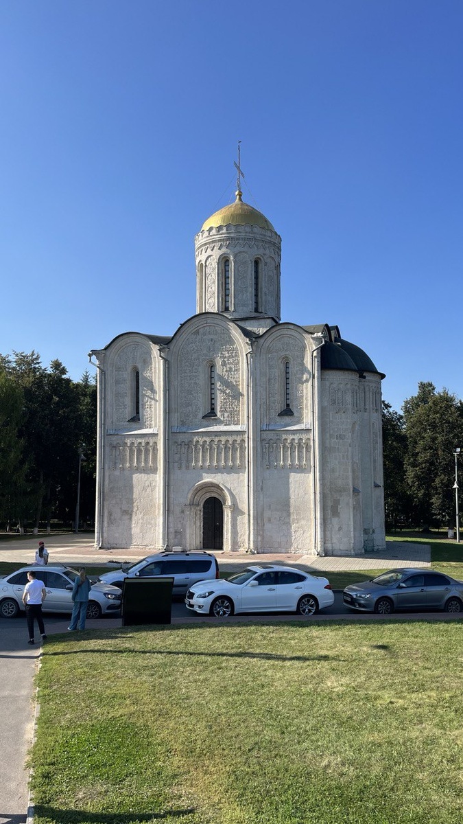 В рамках самостоятельной пешеходной экскурсии по Владимиру мы с семьёй пришли к собору Дмитрия Солунского. Присели на солнышке и зачитали тщательно отобранную информацию: