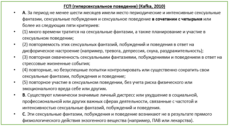 В предыдущей статье были рассмотрены общие характеристики нехимических аддикций. В данной статье хотелось бы подробно рассмотреть одну из них – сексуальную. В первую очередь необходимо отличать сексуальные аддикции от диагноза "Расстройства сексуального предпочтения" (F65 в МКБ-10). Для этого необходимо руководствоваться следующими характеристиками и определениями: 2. Перверсии (МКБ-10, F65) – это расстройства сексуальных предпочтений, включая парафилии (фетишизм, эксгибиционизм, вуайеризм, педофилия, садомазохизм, педофилия, фроттеризм (доставление сексуального удовлетворения путем трения) и т.д. 3. Сексуальная аддикция (Неперверзное гиперсексуальное поведение (ГСП) - это существующий и усиливающийся паттерн или паттерны сексуального поведения, которые продолжают реализовываться несмотря на все более и более серьезные негативное последствия для себя и для других. Так, например, возьмем эксгибиционизм, и, естественно, с критериями нормы он сочетаться не будет, т.к. эксгибиционист попад