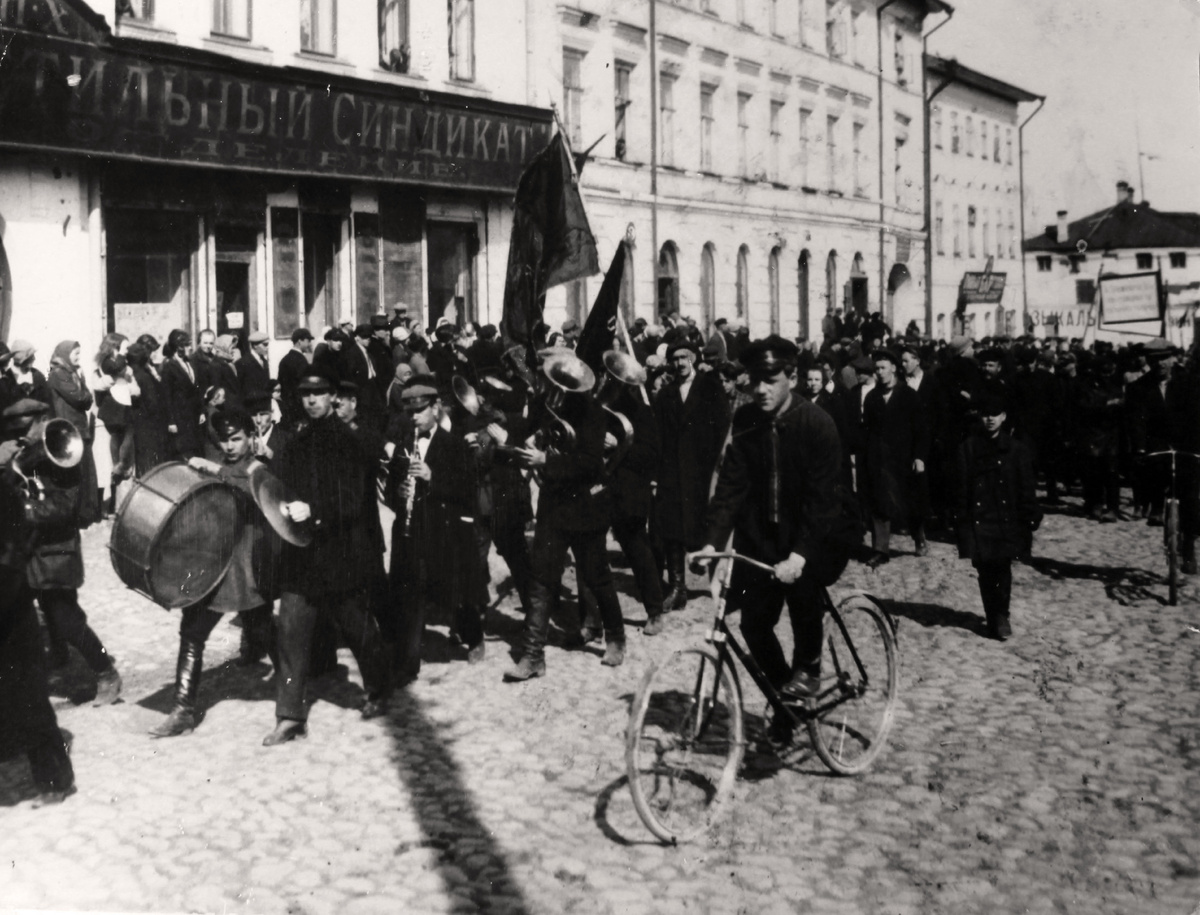Праздничное шествие по Советской улице, 1920-е Историческое название улицы - Кирилловская, а нам она сейчас известна как улица Ленина. Первый дом слева с мощной вывеской "Текстильный синдикат" - это дом мещанки Дьячковой. Он известен своим почти питерским двором-колодцем, про который я рассказывал в одном из роликов на ютуб-канале "История Вологды" youtube.com/@vologdahistory. Следующим идёт дом купчихи Перцовой, который имеет замечательную проездную арку. Уже несколько лет через неё можно попасть во дворы этих домов. Далее дом купца Розанова, которым с 1909 года владел известный вологодский провизор Вацлав Адольфович Паздзерский. А замыкает перспективу дом, про который я не так давно рассказывал. Он был построен купцом Матвем Фёдоровичем Колесовым и был в советский период известен блинной. Как место выглядит сейчас, смотрим здесь - https://vologdahistory.ru/maps/p152/