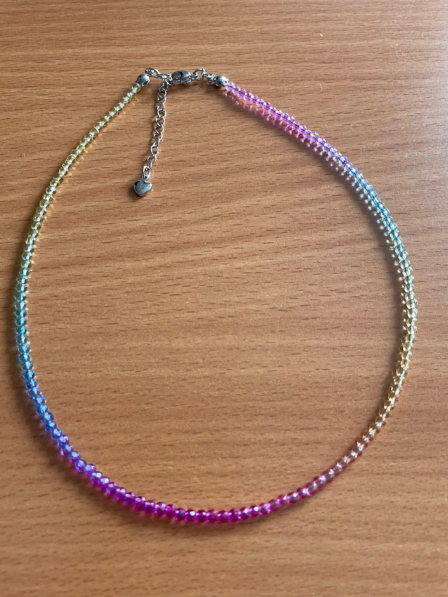 Нежный летний чокер «Радуга» из шпинели Загадочная и прекрасная, волшебная и драгоценная шпинель с давних пор украшала королевские венцы династий по всему миру. Этот искрящийся минерал известен как самоцвет-«обманщик», так как его легко спутать с более дорогим рубином. Кстати, считается, что минерал даже превосходит драгоценный рубин блеском и глубиной окраски. Шпинель относится к категории драгоценных камней 3 порядка. Яркие оттенки камня считают его главным достоинством, благодаря которому он вполне может сравниться с более именитыми «собратьями». Натуральная шпинель может быть красной, розовой, черной, оранжевой, фиолетовой, голубой, синей. Есть и бесцветные варианты, и с желтыми либо зелеными тонами. Окраска определяется видом и долей примесей в составе минерала. Кроме своей красоты, камень наделен большим количеством магических и целительных свойств. С давних времен считалось, что шпинель делает обладателя удачливым, созидательным и целеустремленным. Шпинель будит в человеке ин