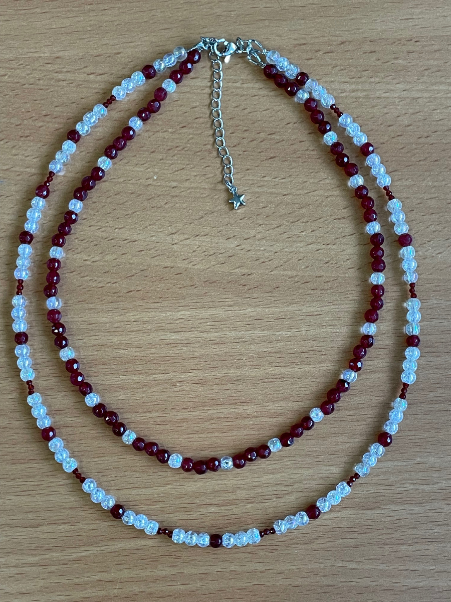 Двойной чокер из сахарного кварца и граненого красного агата. Сахарный кварц обладает массой магических свойств: 💎помогает на пути саморазвития — люди, носящие кварц, становятся более спокойными и мудрыми, у них появляются новые увлечения; 💎он защищает от отрицательной энергии, не дает выкачивать из своего владельца силы (хорошая защита для страдающих от энергетического вампиризма). 💎Считается, что он также помогает найти пару. Поэтому сахарный кварц дарят тем, у кого не получается завести крепкие отношения. Кристалл притягивает в жизнь нового владельца его идеальную половинку и защищает влюбленных от разлуки. 💎Магия красного агата – магия любви и силы. Он снимает напряжение, улучшает восприятие окружающего мира, повышает жизненный тонус. Также он – защитник от опасностей различного рода. 💎Кроме мистический свойств, камень обладает и лечебными. Это настоящий целитель среди минералов, который будет полезен и эффективен при целом списке заболеваний. Так же минерал способен благотво