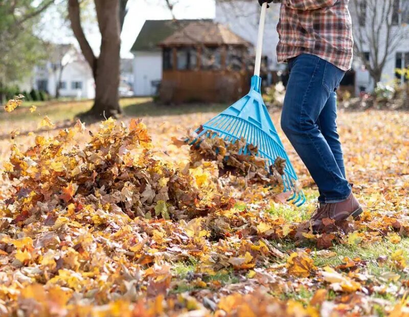 Осенью следует сгребать опавшие листья в кучи или использовать такое оборудование, как газонокосилка с мешком для сбора травы и листьев. Оставлять большие кучи листьев на газоне не рекомендуется — они могут перекрывать растениям свет, что вызывает появление голых участков.