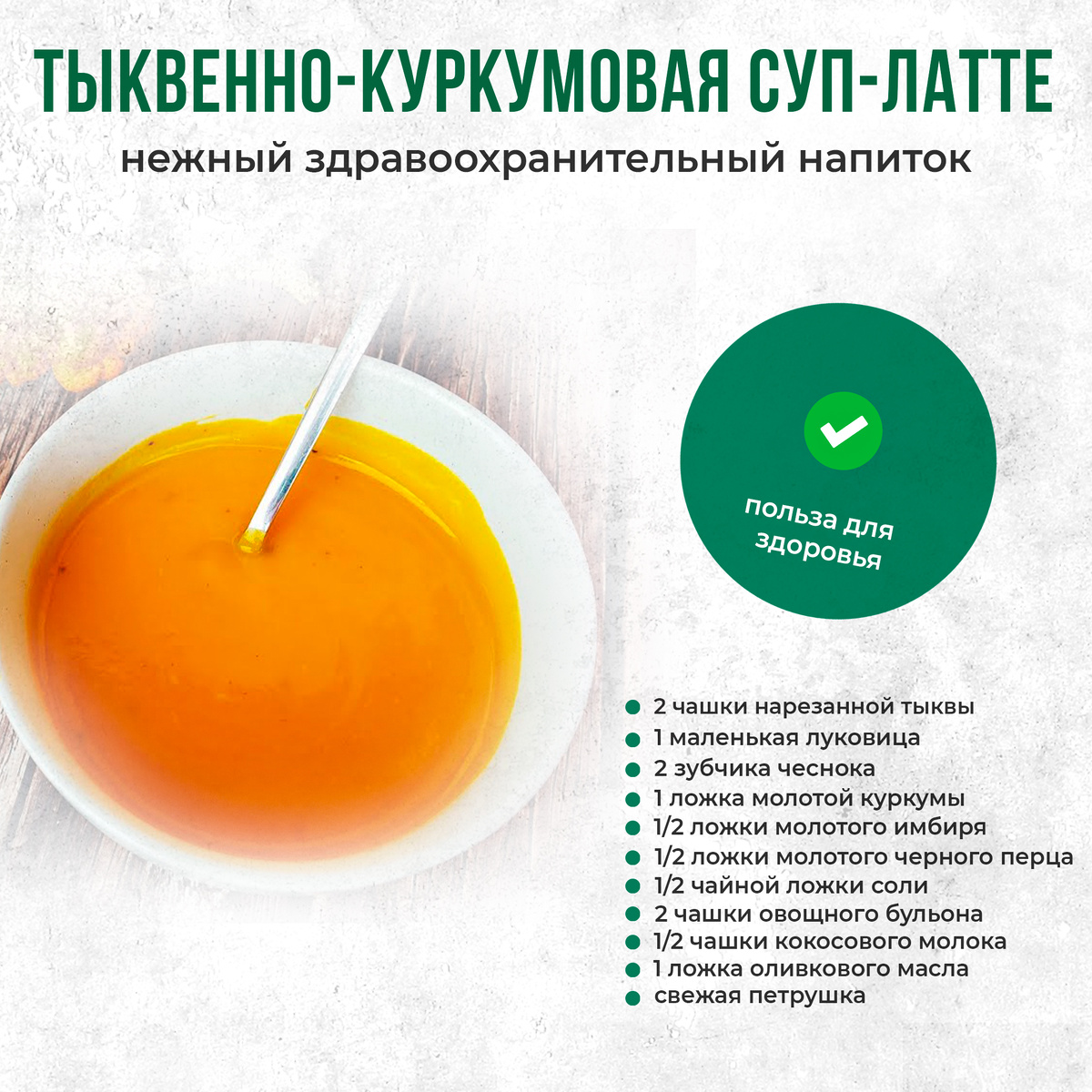Этот рецепт может помочь при снижении воспалений и поддержании иммунной системы. Тыква богата витаминами и антиоксидантами, а куркума известна своими противовоспалительными свойствами. Этот суп-латте может быть полезен при хронических воспалениях и для общего укрепления организма. Этот суп-латте отличается от традиционного супа своей текстурой и ароматом благодаря сочетанию сладкой тыквы и пряной куркумы. Кокосовое молоко придает кремовую консистенцию и легкий тропический привкус. Тыквенно-куркумовый суп-латте - это не только вкусное, но и полезное блюдо, которое поможет улучшить обмен веществ и уменьшить воспаления. Попробуйте этот необычный рецепт, чтобы насладиться вкусом и одновременно позаботиться о своем здоровье.