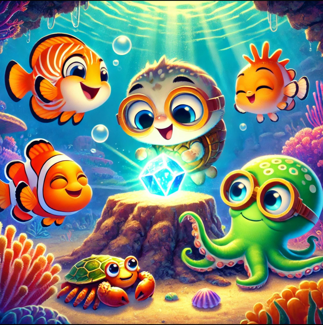 На следующий день Мони, Боул, Гоби и Спайк решили снова встретиться возле большого рифа. Но на этот раз их ждало кое-что новое. Когда они подплыли к месту встречи, перед ними появился старый, мудрый осьминог по имени Оливий, который жил неподалеку. — Привет, ребята! — произнес Оливий, разворачивая свои длинные щупальца. — Я наблюдал за вами издалека и заметил, что вы очень дружные и весёлые. Но у меня для вас есть особая просьба. Мони удивлённо посмотрела на Оливия: — Какая просьба, Оливий? Осьминог, задумчиво глядя на волны, ответил: — Сегодня утром я потерял один из своих самых ценных предметов — морской кристалл. Этот кристалл помогает мне следить за состоянием рифа и помогает в заботе о других морских обитателях. Но я не могу его найти. Я слишком стар, чтобы искать далеко. Не могли бы вы помочь? Боул, полный энтузиазма, махнул хвостом: — Конечно, мы поможем! Это будет настоящее приключение! Гоби и Спайк тоже поддержали идею, и вся команда отправилась в поиски. Они начали о