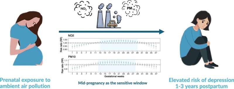 Исследование, недавно опубликованное в журнале Science of the Total Environment, показало, что женщины, подвергавшиеся воздействию более высоких уровней диоксида азота (NO2) или вдыхаемых твёрдых частиц (PM10) во втором триместре беременности, имеют почти четырёхкратный риск развития послеродовой депрессии по сравнению с женщинами, подвергавшимися более низким уровням этих загрязнителей воздуха. Этот повышенный риск сохраняется в течение как минимум трёх лет, согласно исследованию. Трейси Бастейнм (Tracy Bastain) сотрудник кафедры клинической популяции и общественного здравоохранения Медицинской школы Кека Университета Южной Калифорнии (USC) и старший автор исследования, отмечает: «Что действительно нового в этой работе, так это то, что мы смогли расширить изучение депрессии за пределы первого года после родов и показали устойчивое влияние загрязнения воздуха во время беременности на симптомы депрессии на протяжении трёх лет после родов». NO2 образуется при сжигании ископаемого топлив