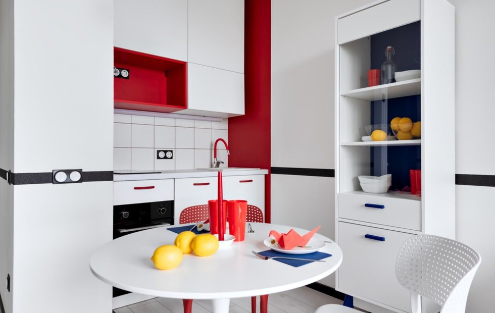 В основе стилистической концепции лежит светлая отделка с яркими акцентами чистого красного и синего цвета. В этих же цветах подобрано освещение. Так как бюджет проекта был сильно ограничен, дизайнер взяла самые простые белые шкафы и тумбы и собственноручно покрасила некоторые элементы (ножки, ручки, переднюю кромку шкафа, заднюю стенку буфета) в яркие цвета проекта. Мебель в нише с кроватью изготовили из фанеры и покрасили вместе со всей нишей в синий цвет.