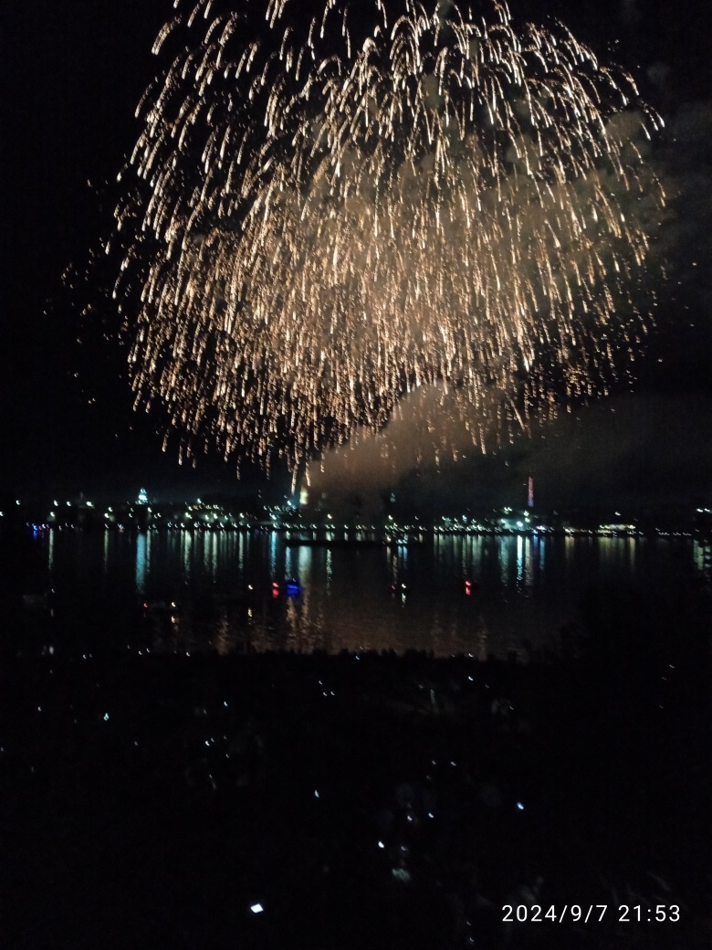 В Костроме, уже в 16-й раз, традиционный праздник – Международный фестиваль пиротехнического дизайна «Серебряная ладья». Тема для участников шоу – «Год семьи». В этом году, впервые, фестиваль в акватории Волги проходил на фоне воссозданного Костромского кремля. Наиболее активные зрители заранее устроились на пляже, прямо на песке, они же оказались и самыми активными и неравнодушными! Скандировали: «Красота! Красота!»
