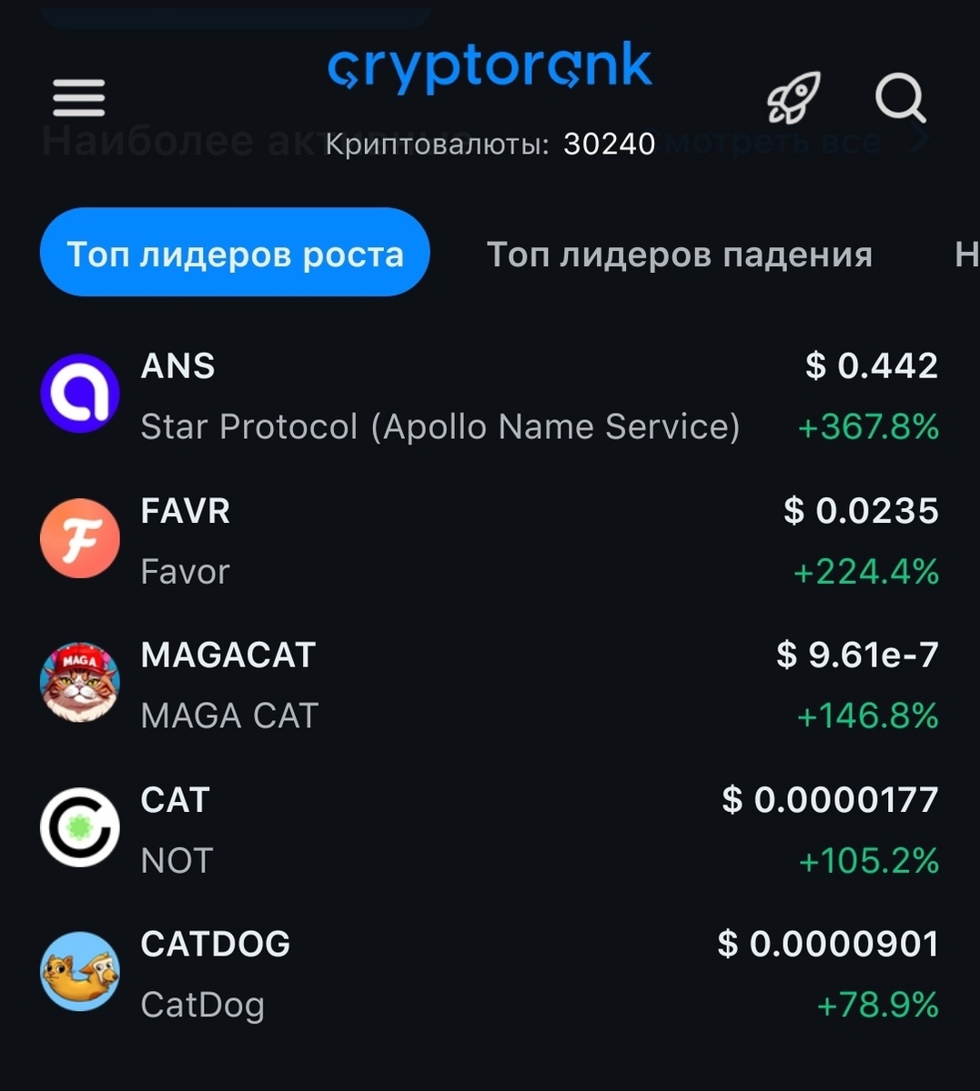 Данный контент не является финансовой рекомендацией. Проводите собственный анализ и принимайте самостоятельные решения. Топ 5 активов роста по данным платформы CryptoRank: 1. Star Protocol (Apollo Name Service) (ANS) +368% Данные анализа DAWR (переоцененность) Анализ Honeypot: 2. Favor (FAVR) +224% Данные анализа DAWR (переоцененность) 3. MAGA CAT (MAGACAT) +147% Данные анализа DAWR (переоцененность) 4. NOT (CAT) +105% Данные анализа DAWR (переоцененность) 5. CatDog (CATDOG) +79% Данные анализа DAWR (переоцененность) При покупке высокорисковых активов соблюдайте риск-менеджмент и не забываете проводить DYOR. DYOR - это проведение самостоятельного детального анализа актива с целью оценить перспективность его покупки. Boosty-канал: DAWResearch Telegram- канал: DAWResearch #dawr #topgainers #ans #favr #magacat #cat #catdog