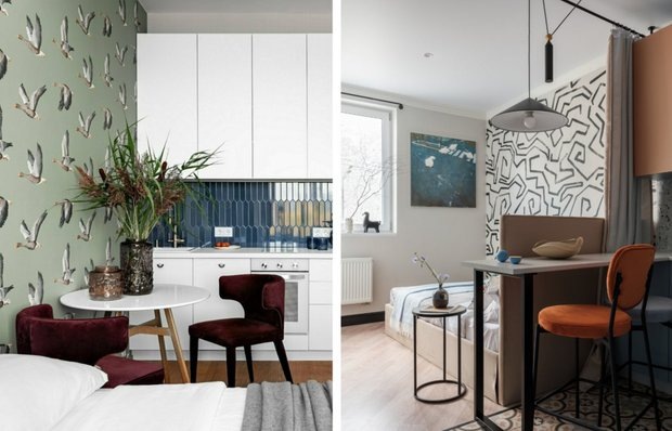 Эффективные и интересные идеи из проектов профи Как стильно и функционально оформить квартиру, если в вашем распоряжении очень ограниченное количество квадратов? Собрали интересные решения из проектов российских дизайнеров — вдохновляйтесь и берите на заметку! Комната с единственным окном — распространенная планировка мини-квартир. Куда ни поставь кровать, все равно будет складываться ощущение, что спишь на кухне. В этом проекте зонирование выполнили с помощью барной стойки и шторы. Компактная конструкция гармонично вписывается в дизайн, придавая неординарный вид помещению. К тому же барная стойка может заменить собой другие предметы меблировки — громоздкий обеденный стол или разделочную поверхность. Главной фишкой этой московской малогабаритки стала гардеробная. Дизайнер Татьяна Макарова оформила ее как настоящий арт-объект в виде зеркального куба. Стены выстроены из пеноблоков и облицованы зеркалом — в них отражается квартира, за счет чего пространство кажется больше. Если под кухню