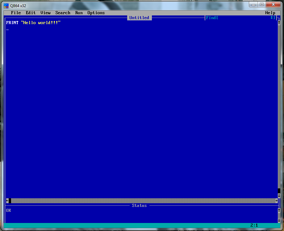 Большая часть языков, относящихся группе Бейсик, позволяет использовать только латиницу. QB64, который мы будем использовать в своей работе, также «понимает» только латинские буквы. Поэтому давайте начнем с вывода на экран приветствия «Hello world!!!», дабы не нарушать традицию.