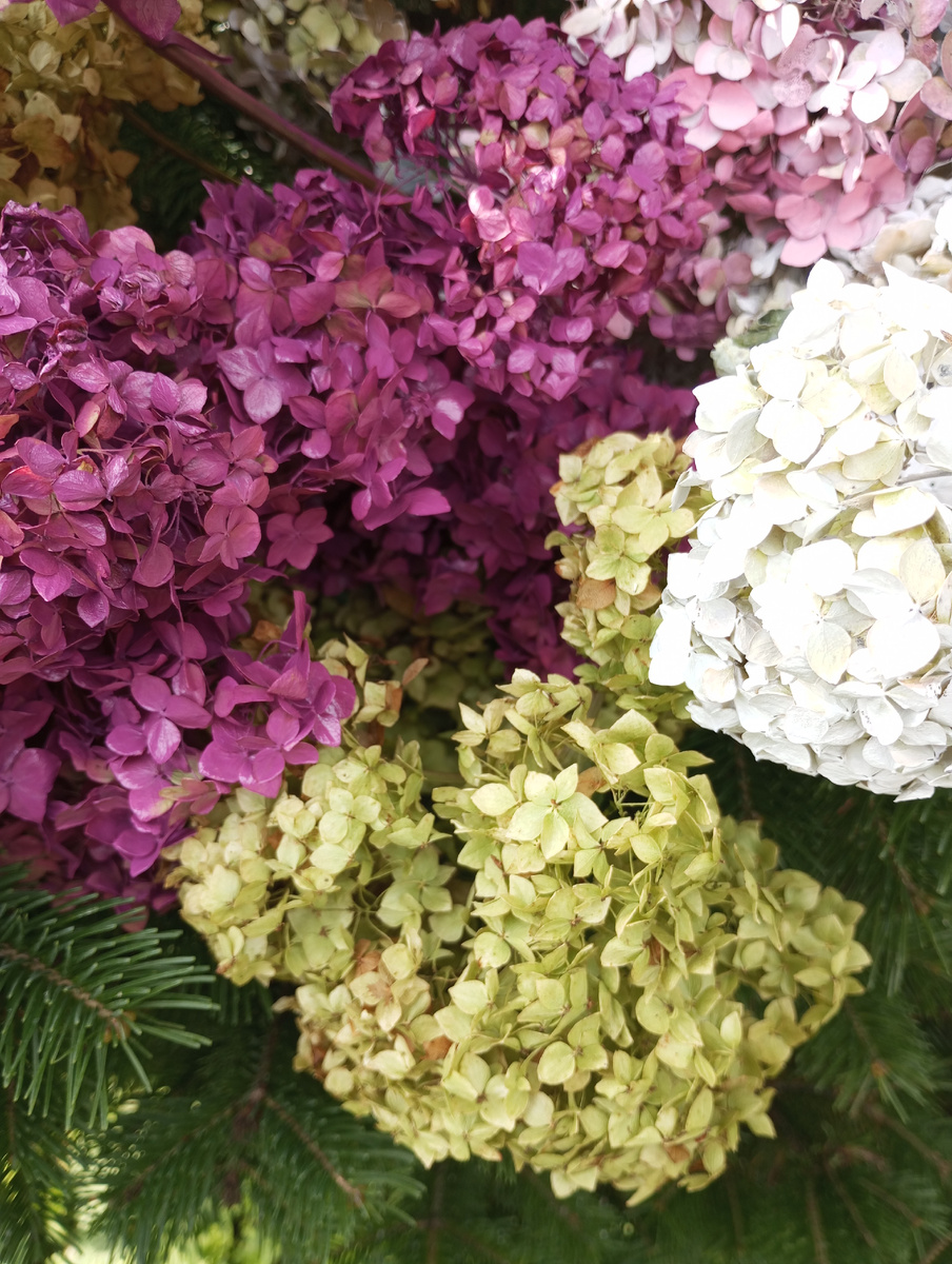 Если вы так же как и я любите гортензию. И вам так же жалко смотреть как она замерзает, то можно сделать следующую красоту. Срезаем ветки с подсохшими соцветиями нужной длины. Подвешиваем в сухом, прохладном месте на несколько дней вниз головой для окончательной просушки. Затем берём акриловую краску в баллончиках и распыляем по соцветиями. Если полностью не прокрашивается не расстраивайтесь, это даже интереснее смотрится. Окрашивать лучше и высушивать на улице, т.к. краска очень сильно пахнет. После высыхания краски можно ещё покрыть слоем акрилового лака, высушить и поставить в вазу. Если же просто букет в вазе вам покажется скучным, то такие соцветия можно использовать в осенне-зимних композициях (на днях покажу композицию, которую буду делать ко дню учителя). Всем удачных работ. Творите и не бойтесь экспериментировать.