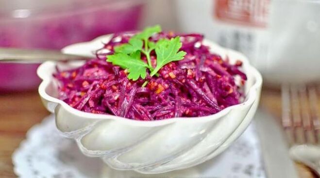 Ингредиенты: Свекла 130, майонез 30, орехи 10, чеснок 2–3 зубца, соль. Приготовление: Это блюдо готовили со сметаной, но теперь, когда стал широко применяться майонез, лучше использовать его, сохранив национальный колорит блюда. Свеклу варят целиком с добавлением уксуса, очищают, измельчают на терке вместе с чесноком, заправляют майонезом, посыпают толчеными орехами. Так же можно добавить и чернослив. Приятного Аппетита!