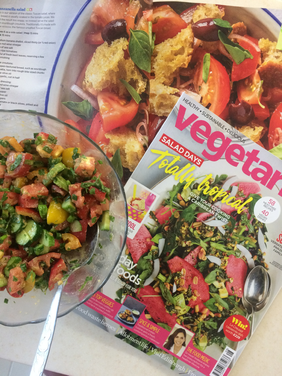 В сезон фруктов и овощей, хочется съесть как можно больше свежего и полезного. Разнообразьте свой витаминный салат необычным сочетанием или иначе нарежьте овощи. На фото, взяла молодую морковь, кабачок и огурец и ножом для чистки овощей сделала полоски, добавила разноцветные томаты, зелёный лук и петрушку, обжаренный тофу. Для заправки использовала соль, перец и сыродавленное масло.