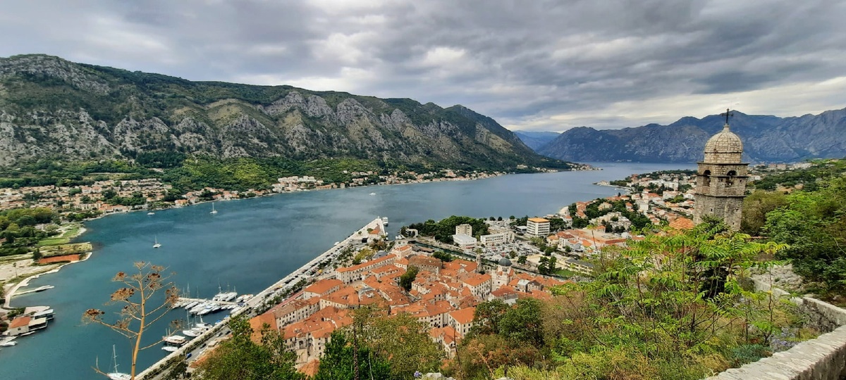 От старого города идет набережная. Если отойти чуть дальше, будет видно, как солнце заливает вершины Ловчена. Если конечно повезет, и солнце выйдет из-за облаков. Мы путешествовали осенью, поэтому оно нас особо не радовало.