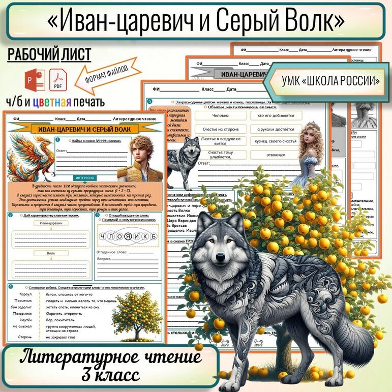 Рабочий лист "Иван-царевич и Серый Волк" 3 класс Литературное чтение Русская народная сказка с ответами для учителя. Можно редактировать Задания размещены на 2-х листах ( можно использовать двухстороннюю печать для экономии бумаги) ДВА ФАЙЛА ДЛЯ ПЕЧАТИ НА ВАШ ВЫБОР : ЦВЕТНОЙ И ЧЕРНО-БЕЛЫЙ. Формат pdf и формат pptx ( с возможностью редактирования файла) Иллюстрации в высоком разрешении. Рабочий лист состоит из 9- ти заданий , рефлексии+ лист с ОТВЕТАМИ для учителя. Приобрести можно здесь