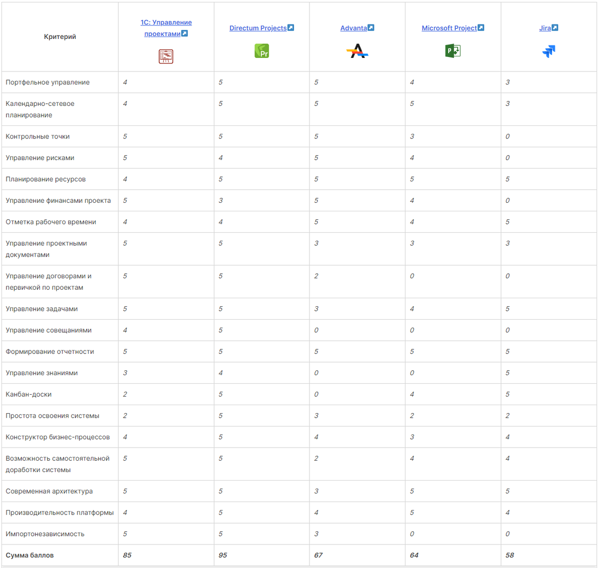 Именно по этим параметрам мы сравнили отечественные системы 1С: Управление проектами, Advanta и Directum Projects с популярными зарубежными сервисами, которые покинули российский рынок — Microsoft Project и Jira. Оценки выставлялись по пятибалльной шкале, где 5 — «функциональность на высшем уровне», 1 — «функциональность есть в системе, но работает плохо» и 0 — «функциональность отсутствует». Максимально один продукт мог набрать 100 баллов. Посмотрим, что получилось: