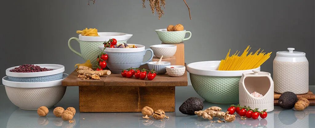 Рассказываем, что это за материал, каковы его преимущества и чем он отличается от остальных керамических изделий. На фото: миски, банки и кувшины из каменной керамики, коллекция Marshmallow Liberty Jones Каменная керамика (по-английски ее называют stoneware) — это особый вид глиняных изделий. Внешне они мало отличаются от фарфора или фаянса, но имеют более плотную и прочную структуру. Чтобы добиться таких свойств, на производстве следуют специальным технологическим процессам. На фото: миска с ягодным узором Russian North от Tkano и формы для запекания Marshmallow от Liberty Jones Каменную керамику обжигают при очень высоких температурах — до 1400°С. В таких условиях из глиняной массы полностью устраняются влага и воздух, а сама глина спекается и становится похожа по фактуре на твердую губку с очень мелкими порами. Параллельно с этим происходит процесс плавления диоксида кремния (кварцевого песка), входящего в состав глиняной массы. Он становится жидким, превращается в стекло и проника
