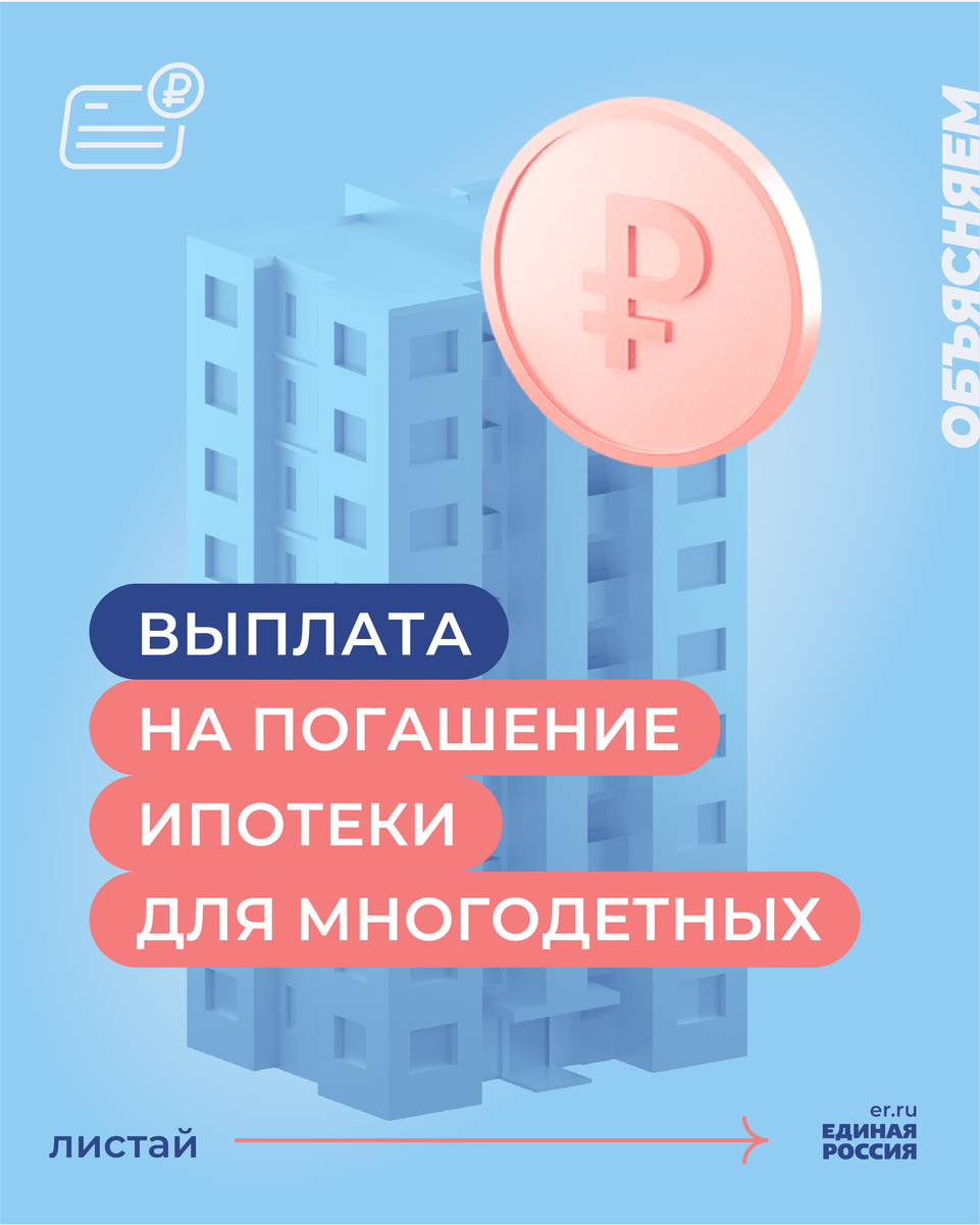 Один из главных приоритетов народной программы Единой России — поддержка семей с детьми. Родители имеют право на различные выплаты. Например, многодетные семьи, у которых есть ипотека, могут получить 450 тысяч рублей на погашение кредита. Информацию об этой мере поддержки собрали в наших карточках.