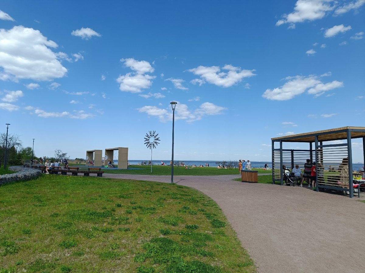 Парк «Стрельнинская бухта» - новое общественное пространство в поселке Стрельна на берегу Финского залива! Автомобилистам и пешеходам попасть в парк можно с Нижней дороги, а вот велосипедистам рекомендую предварительно прокатиться по этой самой дороге из Петергофа до «Стрельнинской бухты». Нижнюю дорогу нельзя назвать живописной, но она достаточно широкая и удобная для велопрогулки. Мы с мужем из Петергофа на велосипедах с Санкт-Петербургского проспекта спустились вниз по улице Чайковского и за церковью цесаревича Алексея, повернув направо, попали на Нижнюю дорогу. По Нижней дороге очень приятно прокатиться на велосипедах, особенно в хорошую погоду и через 25-30 минут пути можно добраться из Петергофа до парка «Стрельнинская бухта». Парк прекрасно подходит для прогулки взрослым и детям! Воздух там чистый, морской, свеженький! Территория грамотно разделена на зоны: есть пляж с шезлонгами изогнутой формы под зонтиками, баскетбольная площадка, другие спортивные площадки, зона барбекю, дет