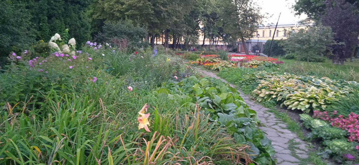Отправилась в очередной раз полюбоваться красотой цветущих растений. Сад доступен для посетителей в любое время суток. Гуляющих в саду в вечернее время немного Сразу на входе привлекает внимание цветущий куст роз. Никого не оставляет равнодушным эта красота. Три женщины восхищались этими розами и я остановилась сделать фото Женщина-смотритель сада зорко следит, чтобы клумбы не топтали и растения не обрывали Белая и розовая бегонии разрослись и образовали разноцветный ковер. А в начале лета клумба выглядела не так привлекательно Плантация хризантем начинает зацветать. Потом приду полюбоваться красотой! Плоды японской айвы очень интересные. Еще не поспели...Одна посетительница сада думала что это яблоки, но я ее поправила Петунья, посаженная заботливыми руками сотрудниками Комитета по благоустройству, буйно цветет. Хороша! Розовая уже отцветает На этой клумбе высажены колеусы и ярко желтое растение, название которого я не знаю. Может гелиопсис? Густо посаженный хостарий уже выглядит не т