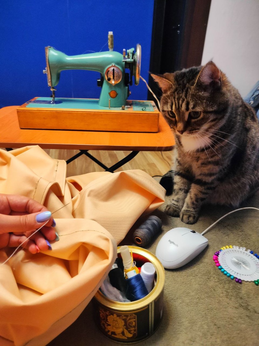 Машинка у нас советская, с электрической педалью. На ней, кажется, можно и дрова шить)) Лапка обычная, нитки подобрали составные, хб с капроном или лавсаном. По наметанным швам сострочили все детали, вторым швом прошли по подгибам от осыпания. Центр малого купола, на месте пересечения треугольников, укрепили шестиугольной накладкой. Нижний купол, для удобства надевания на каркас, застегивается на липучку. По углам купола пришили завязки из используемой тентовой ткани. Между куполами пришли кусочек москитной сетки, чтобы кусачая мелочь не залетала на огонёк через крышу)) Отдельно сшили шторы из москитной полиэфирной сетки чёрного цвета на "стены" беседки. Два полотна 2,2х6 м. В верхней части - шторная лента с петлями. Нижняя часть укреплена тканевой полос