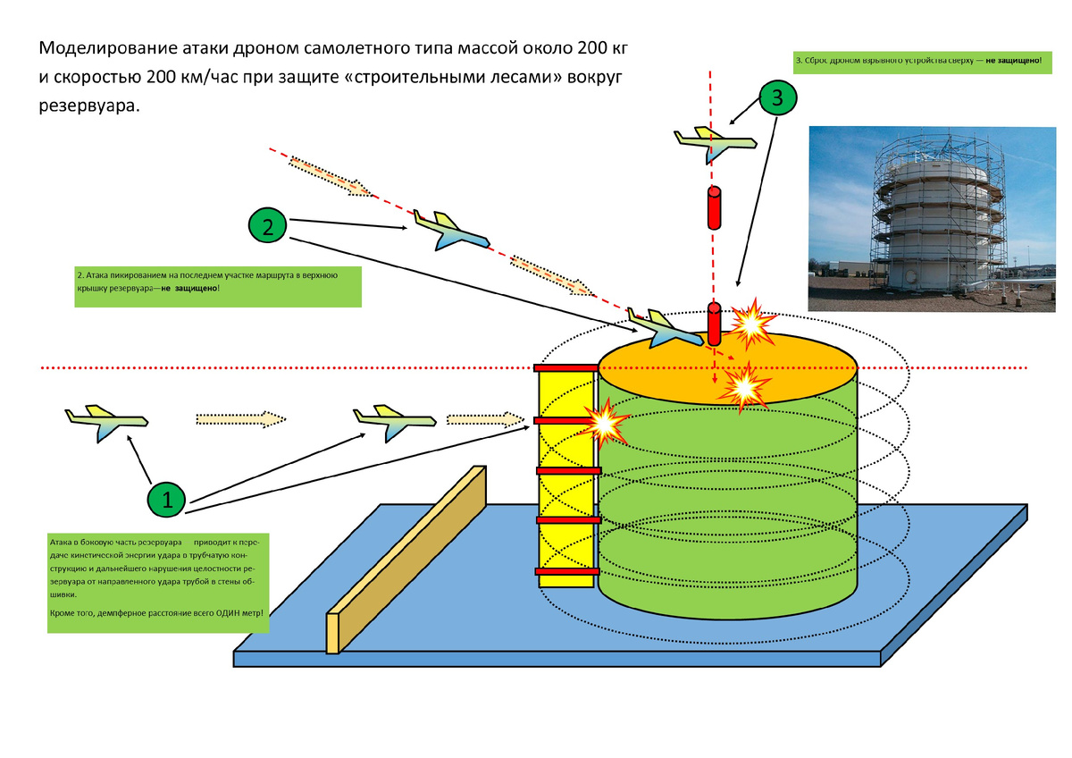 Другой странный и очень нелепый способ физической защиты от дронов - возведение строительных лесов вокруг конструкции. Самое уязвимое место такой формы защиты - накопление осадков. Строительные леса накапливают наледь, снег и не выдерживают нагрузку. Сама трубчатая конструкция вообще не рассчитана на боковую нагрузку, а строго на вертикальную, ведь её функция - постоянная лестница-приставка для фасадных или отделочных работ. Боковая нагрузка создается кинетической энергией при попадании тяжелого дрона - он просто пробивает трубами лесов резервуары. Само "безопасное расстояние", формируемое при такой странной форме защиты составляет всего один метр. И никакой безопасности при взрыве дрона точно не даёт. Кроме того, конструкция лесов вообще не способна защитить от FPV-дронов и дронов вертолетного типа, поскольку пролеты между трубами не менее 70 см. Более подробно получить расчеты атаки дрона на защиту строительными лесами и сравнить с другими способами физической защиты можно путём по