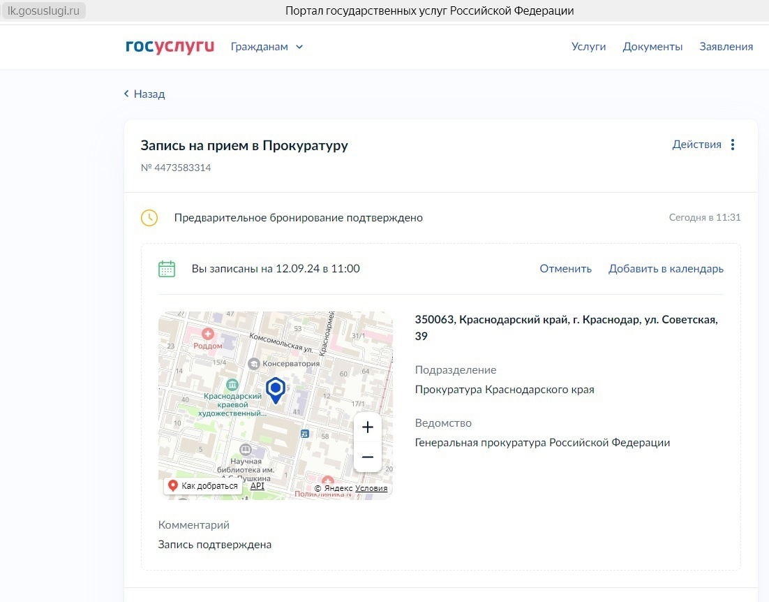 В этот же день я также официально записался на личный приём в органы прокуратуры. Обращение зарегистрировано под №4473583314.