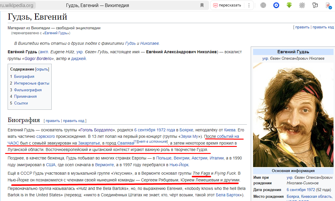 Лучше один раз увидеть, чем 100 раз услышать. Недобитки Gogol Bordello - русофобы чистой воды. Их лидер Женя Гудзь, цыган, некогда гордился советским прошлым. Пока не эмигрировал в США. Там кукушка поехала. Ну, сами посудите, кто назовёт свою группу THE FAGS, тобишь ТЕ САМЫЕ ПЕДИКИ. Чуви реально загнался. Сделал это ради хайпа. В совке он бы под столом кукарекал, а в западном демократическом обществе педерастом быть можно свободно. Ну, и понесло панка-цыгана. После была ещё одна группа, летающий трах или что-то в этом духе FLYING FUCK. Короче говоря, заднеприводный Женя. Википедия ж не врёт? Там же в США, тот самый педик Гудзь познакомился с Серёгой Рябцевым. Где-то на задворках в пьяном угаре облизывали яйца друг другу. Ну, в смысле целовались в дёсна, земляки ж почти что. Рябцев вроде не педик. В группах со стрёмными названиями не участвовал. Да и женат. Про супругу свою он на каждом шагу трубит. Какое, мол, ему счастье привалило. Благодаря ей эмигрант увидел мир. Ольга Матешко и