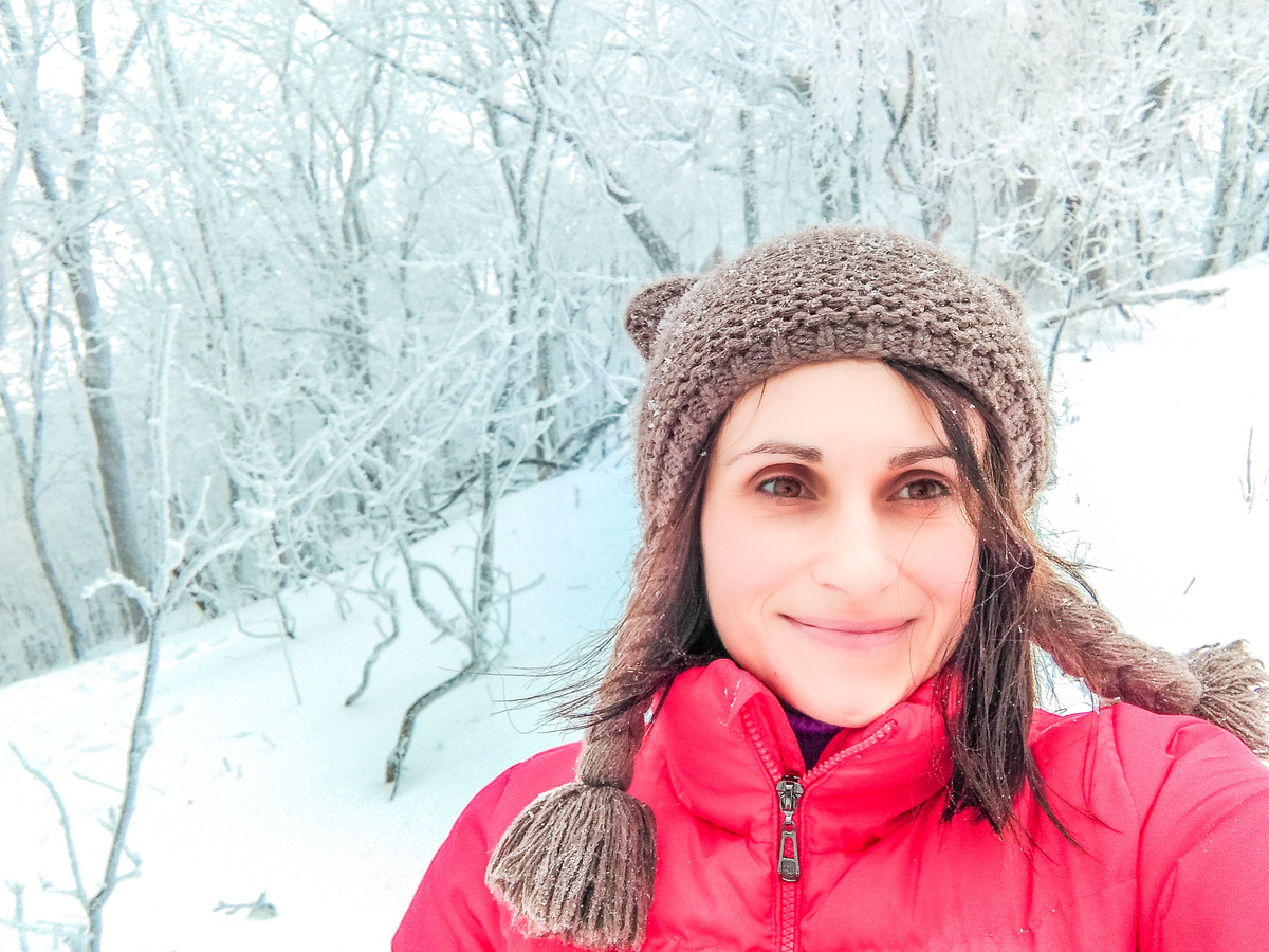 Подъём к Холодному кулуару начинается от Ангарского перевала через заснеженный буковый лес. И лес был настоящим зимним, сказочным. Радостно было находится в таком лесу, поэтому подъём был по снегу хоть и непростым, но каким-то весёлым :) Хотелось изо всех сил насмотреться на эту красоту, надышаться этим гулким воздухом и впитать всё это в себя и стать тоже чуточку светлее и красивее как этот лес. Первый раз в руках ледоруб, а на ногах кошки, торчащие из под шапки волосы покрылись инеем, ноги слегка подмерзают, но весь подъём прошёл на одном дыхании. А на вершине нас ждал жуткий ветер и ничего не было видно, но чем дальше от вершины тем ветер становился тише и открылись виды на Алушту.