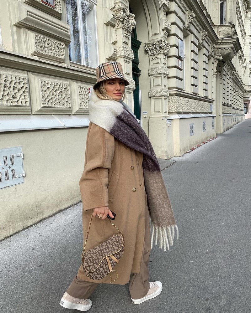 Ноябрь самый неудобный месяц для модницы. Вроде ещё рано зимний гардероб носить, а с другой стороны в осеннем уже холодно. Подготовила для вас 7 примеров, как можно стильно одеться в ноябре. Бежевый цвет, один из самых востребованных в 2024 году. Широкое пальто прямое с двумя рядами пуговиц, благодаря которым не нужен, привычный нам пояс. Утепляющим образ стал широкий шарф. Надо отметить, что мода на шарфы всегда актуальна. В этом же году нужно отдать предпочтение шарфам, покрывающим плечи. Лёгкость образу добавляют кеды. А чтоб они не вызывали дисбаланс тепла - были выбраны на высокой подошве. А панама отлично сочетается с сумкой. Кстати, в этой зимой утеплённые панамы настигнут пика свой популярности. Об этом мы писали в статье на канале. Цветовая гамма очень схожа с предыдущим образом. Пальто приталенное подчеркивает фигуру, в сочетании с кожаными брюками. Под пальто одет свитер средней длины, горло которого гармонично сочетается пальто. Особый образ интеллигенции добавляет прямая