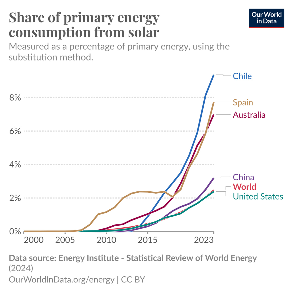 В 2023 году в Чили 9,4% первичной энергии было произведено за счет солнечной энергии — это самый высокий показатель среди стран в этом году.