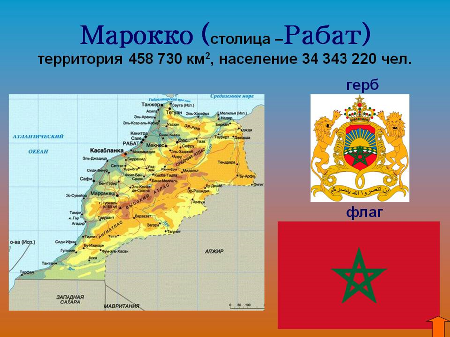 Стоя на африканском берегу Марокко, можно без труда наблюдать за движением машин в европейской Испании. Согласно древним традициям, символом любви в Марокко считается не сердце, а печень. Для выходцев из Марокко всегда очень обидно, когда люди удивляются тому, что здесь живут не чернокожие, как в остальной Африке.