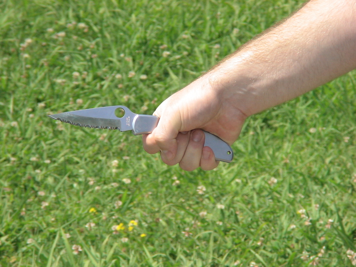 — прямой хват: лезвие смотрит в сторону большого пальца, пальцы плотно обхватывают рукоять;
